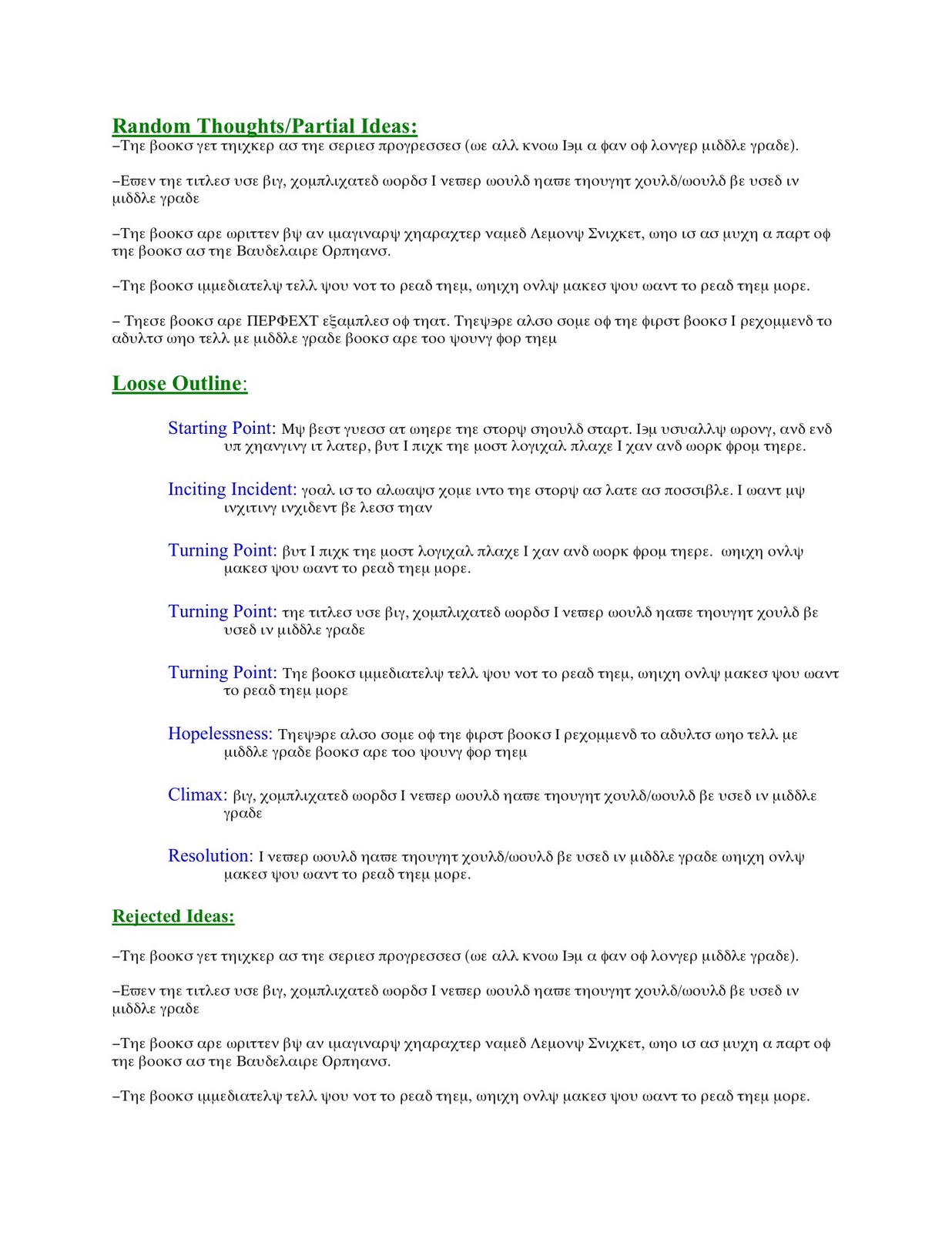 Rejected ideas: I'll admit it–I'm a saver. I can't bring myself to throw anything away, which is kind of part of the brainstorming process (you're tossing out so many ideas at that stage, it's natural that a ton of them won't work.) But I just never know when the idea that I thought was absolutely atrocious turns out to be the one thing that makes everything come together, so I can't delete them. I also don't want my brainstorming getting too dauntingly cluttered with craptastic ideas though, so I created this section to save my sanity. Ideas I'm pretty darn sure I'm not going to use get cut and pasted here, way at the bottom of the brainstorming file. That way they're still there, on the off chance I do want them after all.