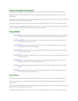 Main Characters: A quick list of all the characters essential to the story, along with a couple of sentences defining their role. I do MUCH more in-depth character development for each character in a separate file (something I will cover in a later post) but I like to list them here because it helps me to see if I have too many characters, too few, and how they're going to interact with each other. I also use this as sort of the testing ground to decide if a character is worth developing further, or if I have a dud on my hands and need to go back to the drawing board.
