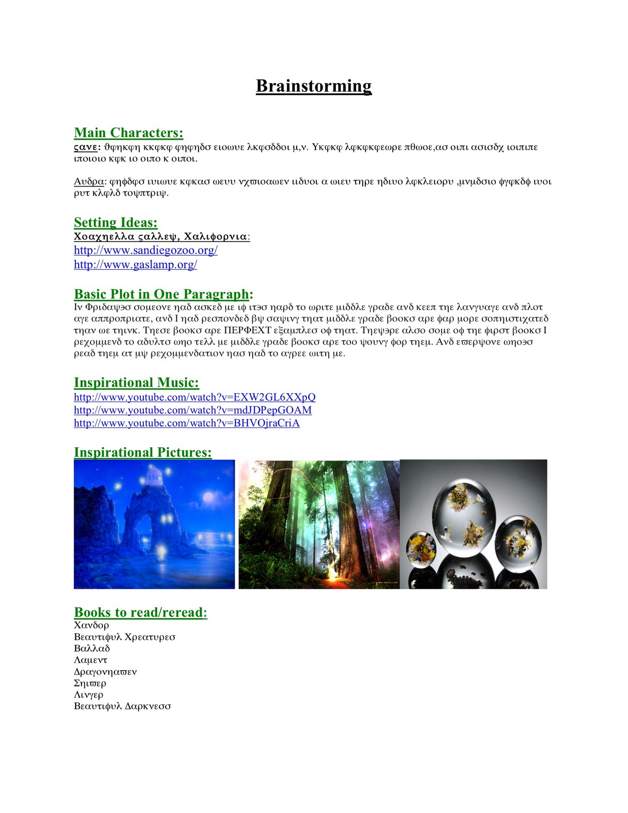 Setting Ideas: Personally, I like my setting to be an integral part of the story, whether it's a world I've created or a real, existing place. So I do a lot of brainstorming to figure out where the right setting is, and all the key “locations” in that setting. A lot of times this section gets filled with links to things I've found via google, sometimes even a few pictures if I find something perfect. But this is the space for my brain to visualize all the places that will be in the book, and make sure it's as rich and detailed as possible.